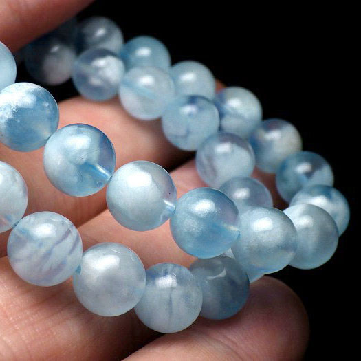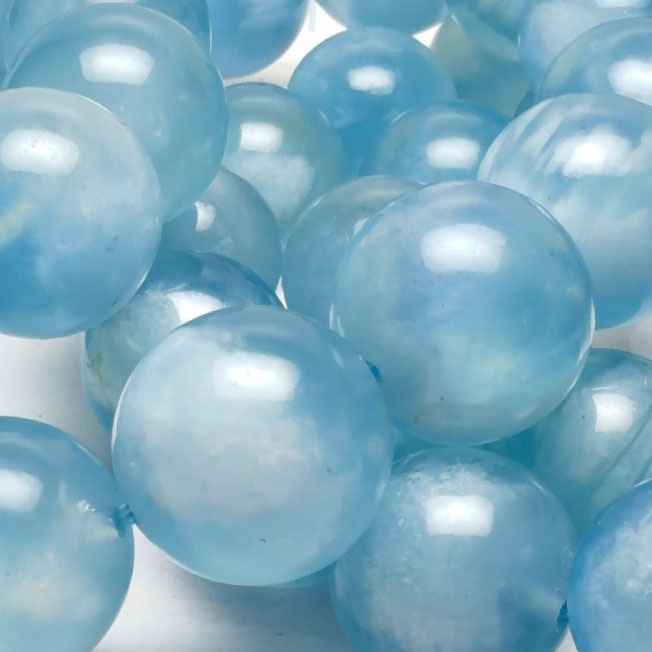 半透明でとろりとした水色の粒は、透明度や光の反射によって表情を変え、 ひとつのブレスレットの中にさまざまな青の世界が広がります。
